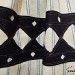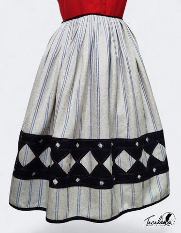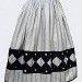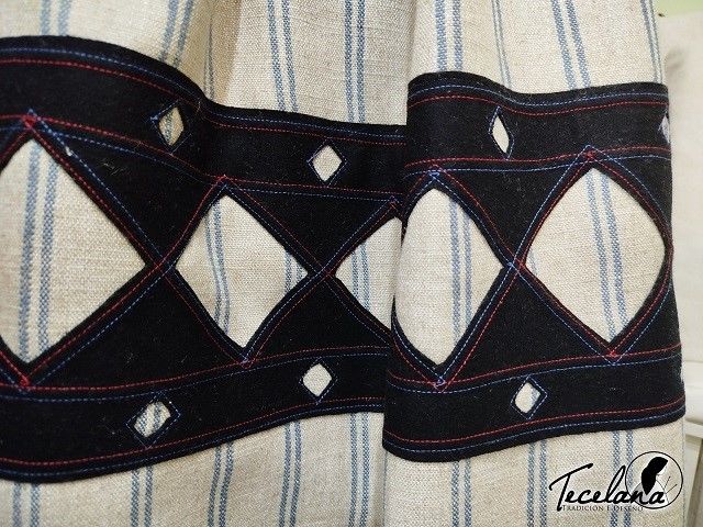 Mezcla de lino rayado, con pespuntes de paño negro, bordado con máquina.